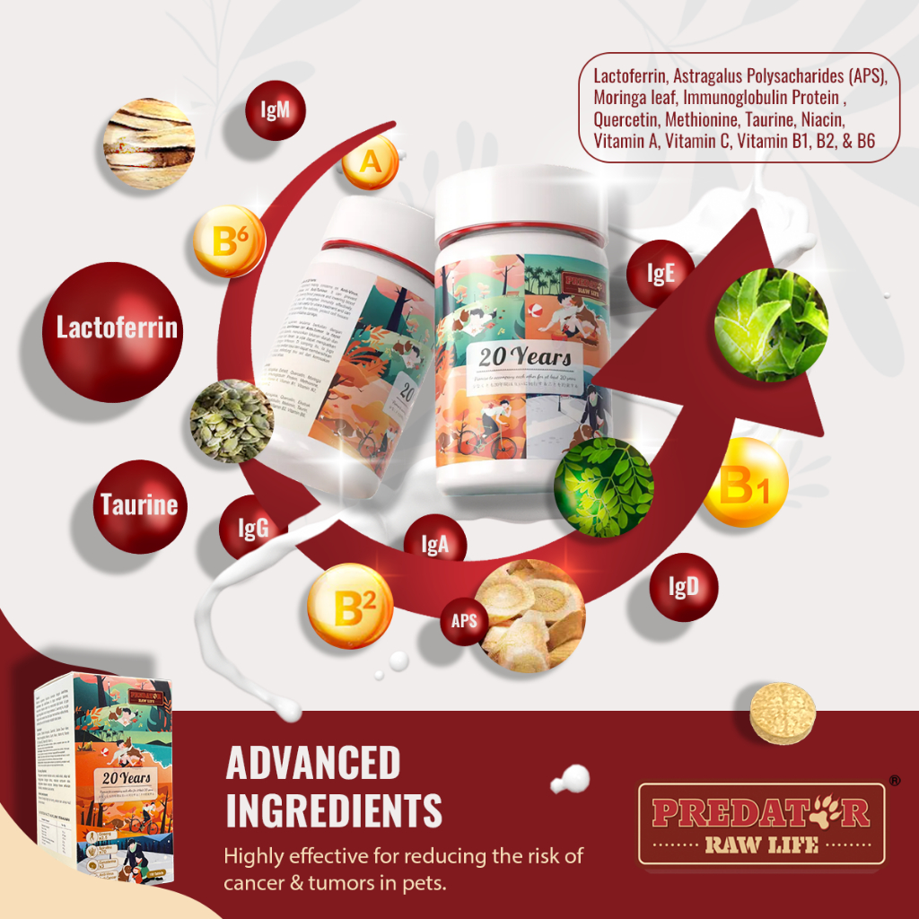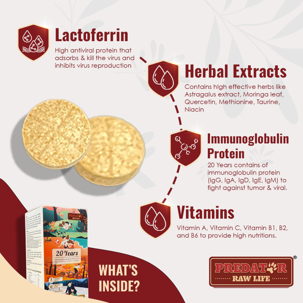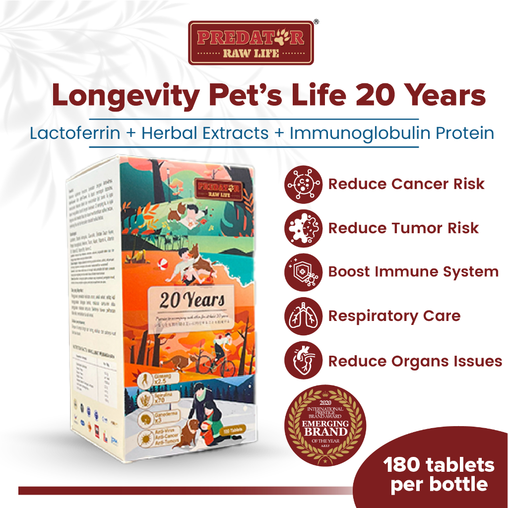 - Boost Immune System: With key ingredients like lactoferrin, astragalus extract, and immunoglobulin protein(IgG, IgA, IgD, IgE, IgM), 20 Years is designed to enhance your pet’s immune system, helping to protect against viruses, tumours, and other health issues.
