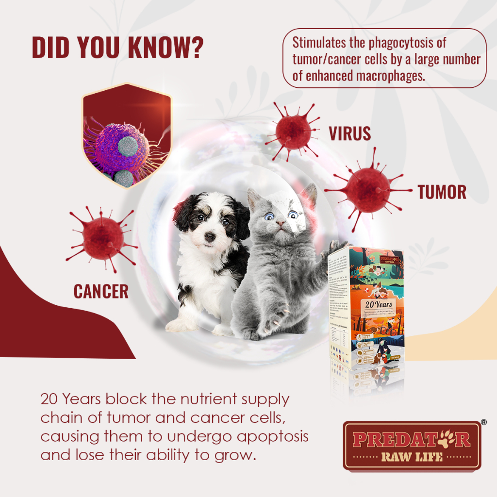 The scientific theory behind 20 Years is centered around its ability to block the nutrient supply chain of tumor and cancer cells, causing them to undergo apoptosis and lose their ability to grow. This, combined with the stimulation of the phagocytosis of tumor/cancer cells by a large number of enhanced macrophages, makes 20 Years a highly effective and powerful product for preventing and reducing the risk of cancer and tumors in pets.