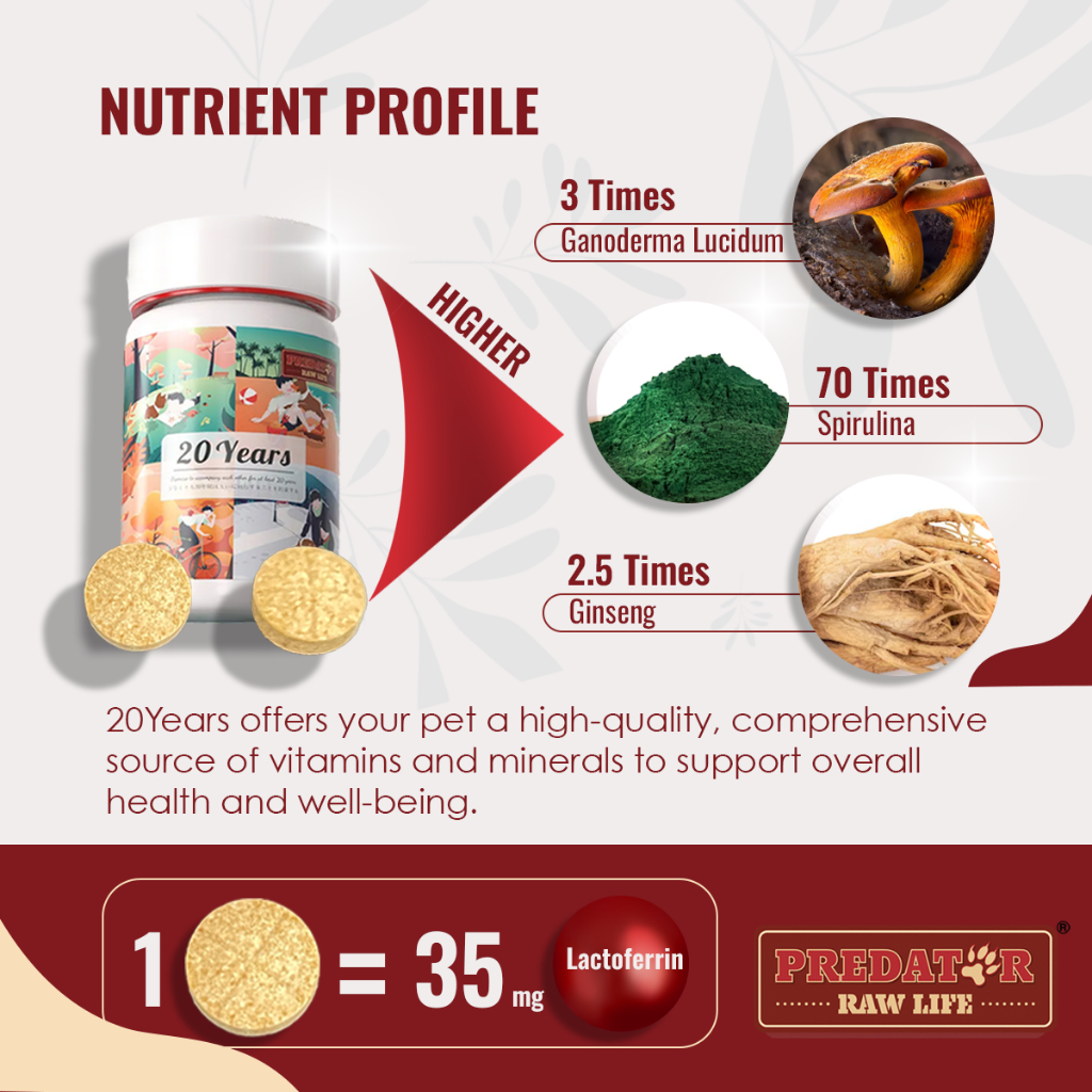 - Nutritional Powerhouse: With a nutrient profile that is 2.5 times higher than ginseng and 70 times higher than spirulina, 20 Years offers your pet a high-quality, comprehensive source of vitamins and minerals to support overall health and well-being.