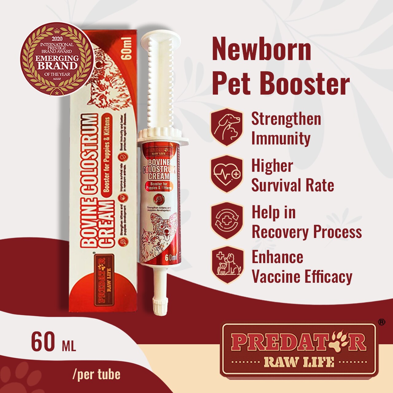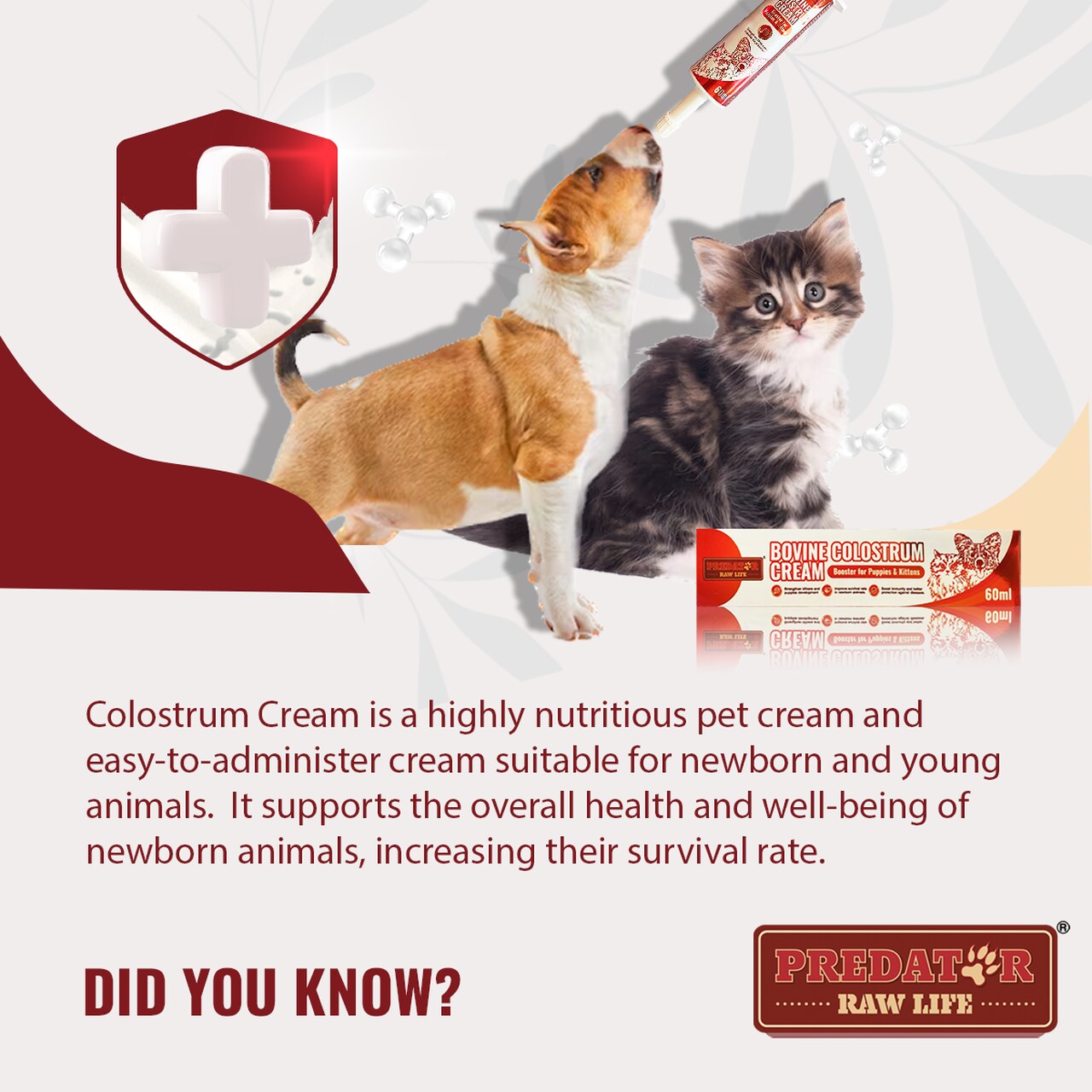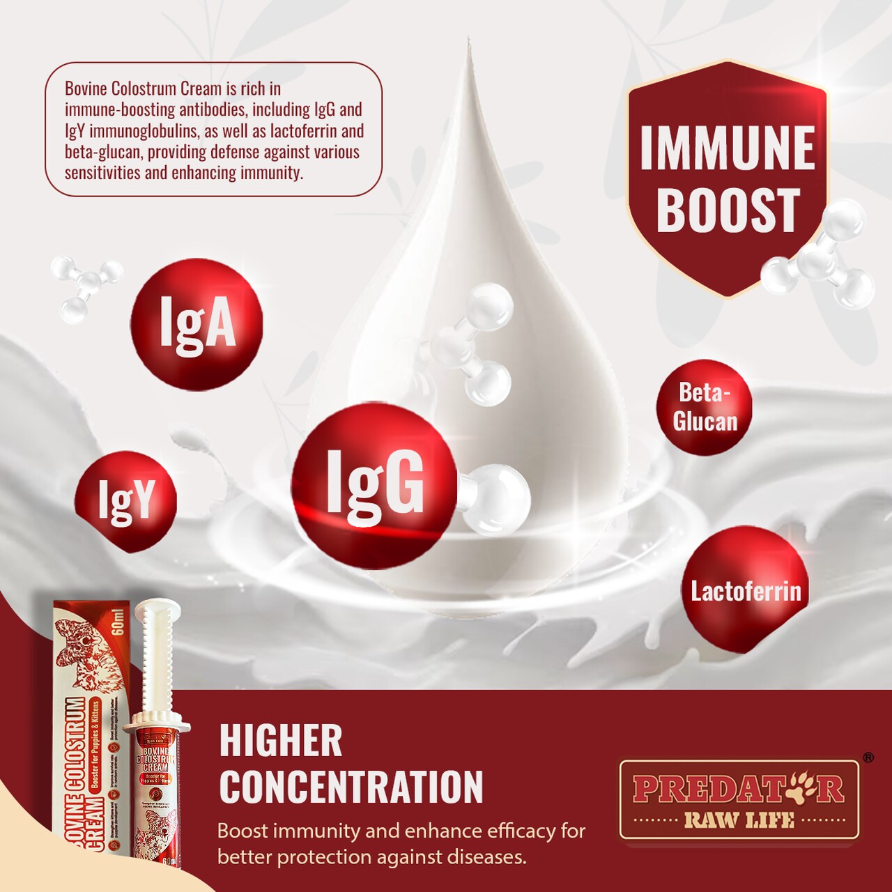 Colostrum Cream is a highly nutritious pet cream formulated with fresh meat puree and hydrolyzed fish protein as the base. It is a soft and easy-to-administer cream suitable for newborn and young animals, ensuring optimal digestion and absorption. Derived from the colostrum of grass-fed cows within 48 hours of calving, this cream is rich in immune-boosting antibodies, including IgG and IgY immunoglobulins, as well as lactoferrin and beta-glucan, providing defense against various sensitivities and enhancing immunity. It supports the overall health and well-being of newborn animals, increasing their survival rate.