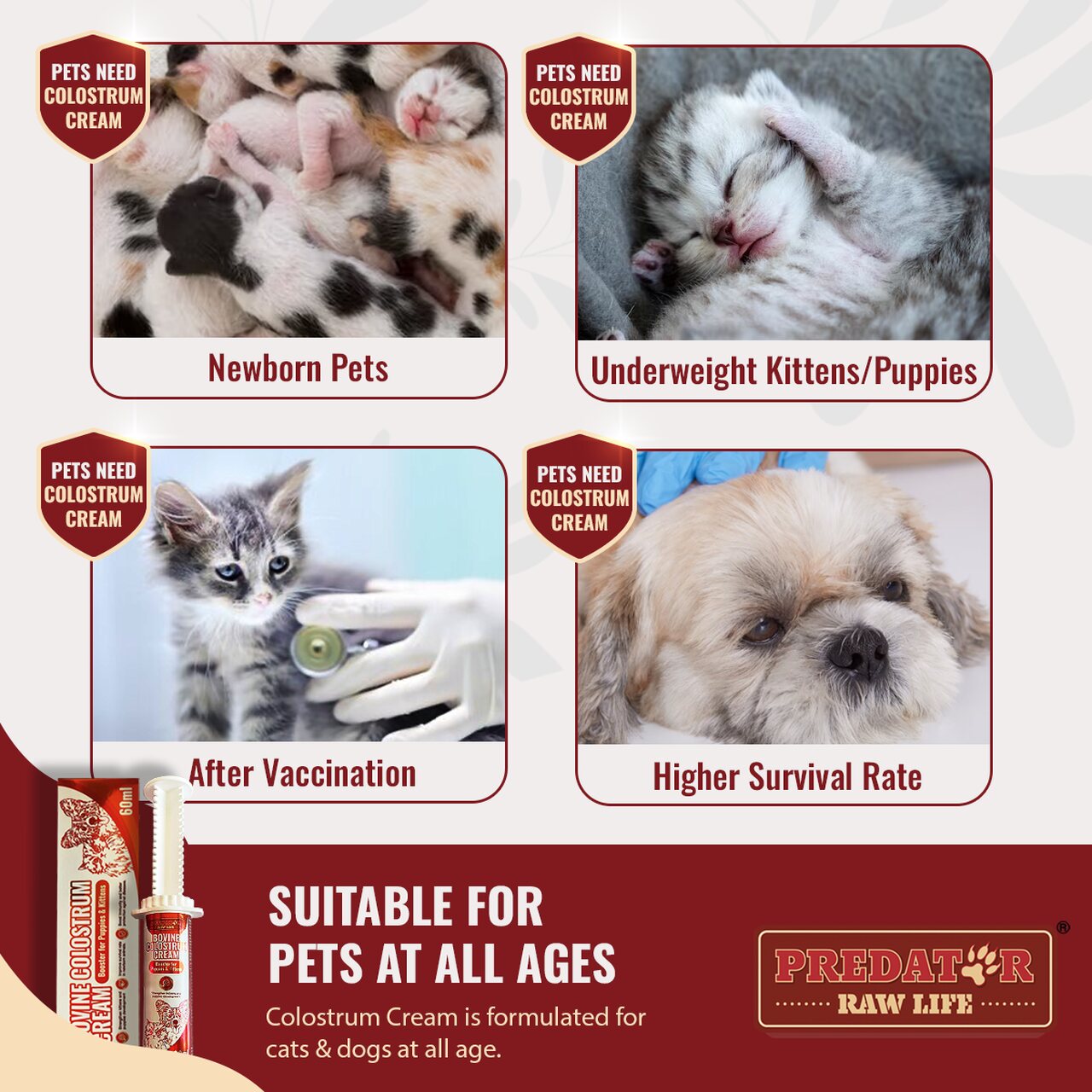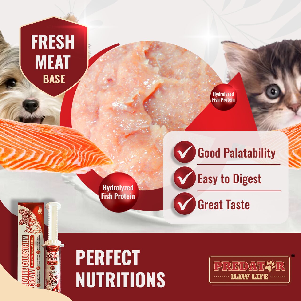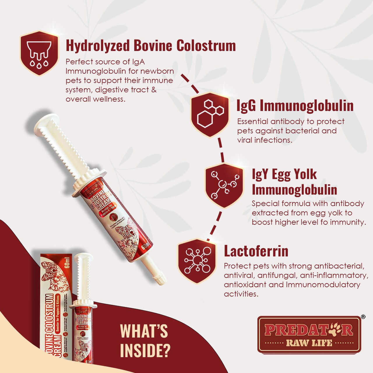 Colostrum Cream is a highly nutritious pet cream formulated with fresh meat puree and hydrolyzed fish protein as the base. It is a soft and easy-to-administer cream suitable for newborn and young animals, ensuring optimal digestion and absorption. Derived from the colostrum of grass-fed cows within 48 hours of calving, this cream is rich in immune-boosting antibodies, including IgG and IgY immunoglobulins, as well as lactoferrin and beta-glucan, providing defense against various sensitivities and enhancing immunity. It supports the overall health and well-being of newborn animals, increasing their survival rate.